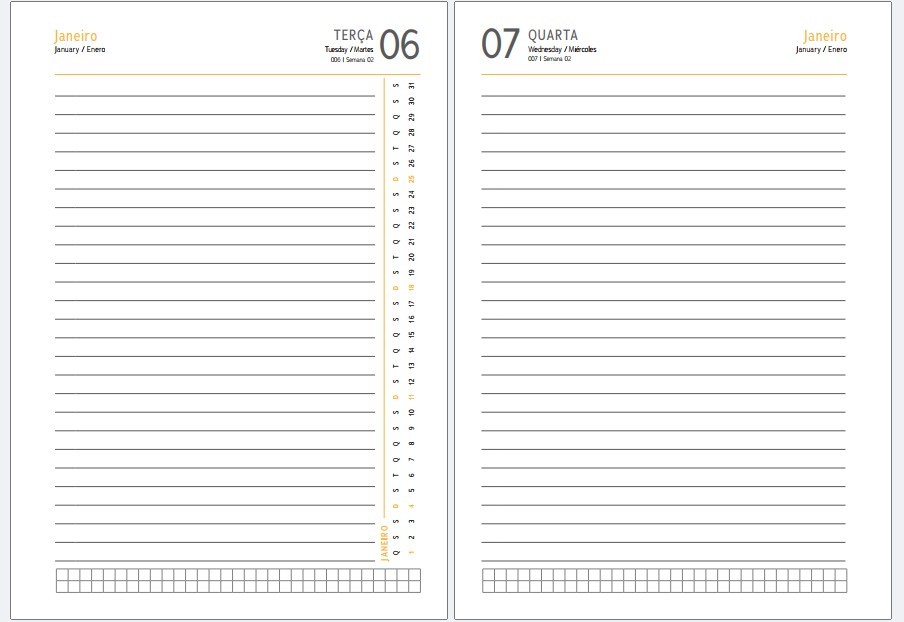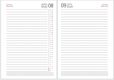 - Design Interno: A agenda oferece uma experiência de planejamento diária com 1 dia por página, garantindo espaço suficiente para anotar todas as suas tarefas e compromissos. Nos finais de semana, dois dias são combinados em uma única página, somando um total de 332 páginas.