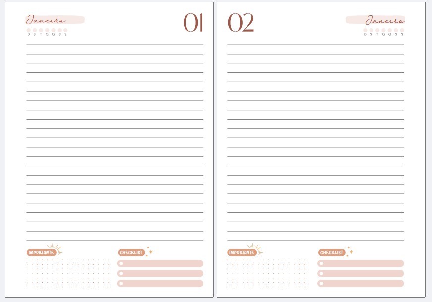 • Design Interno: Diário com 1 dia por página e finais de semana com 2 dias em uma página, totalizando 374 páginas. O miolo é padrão e não personalizável.